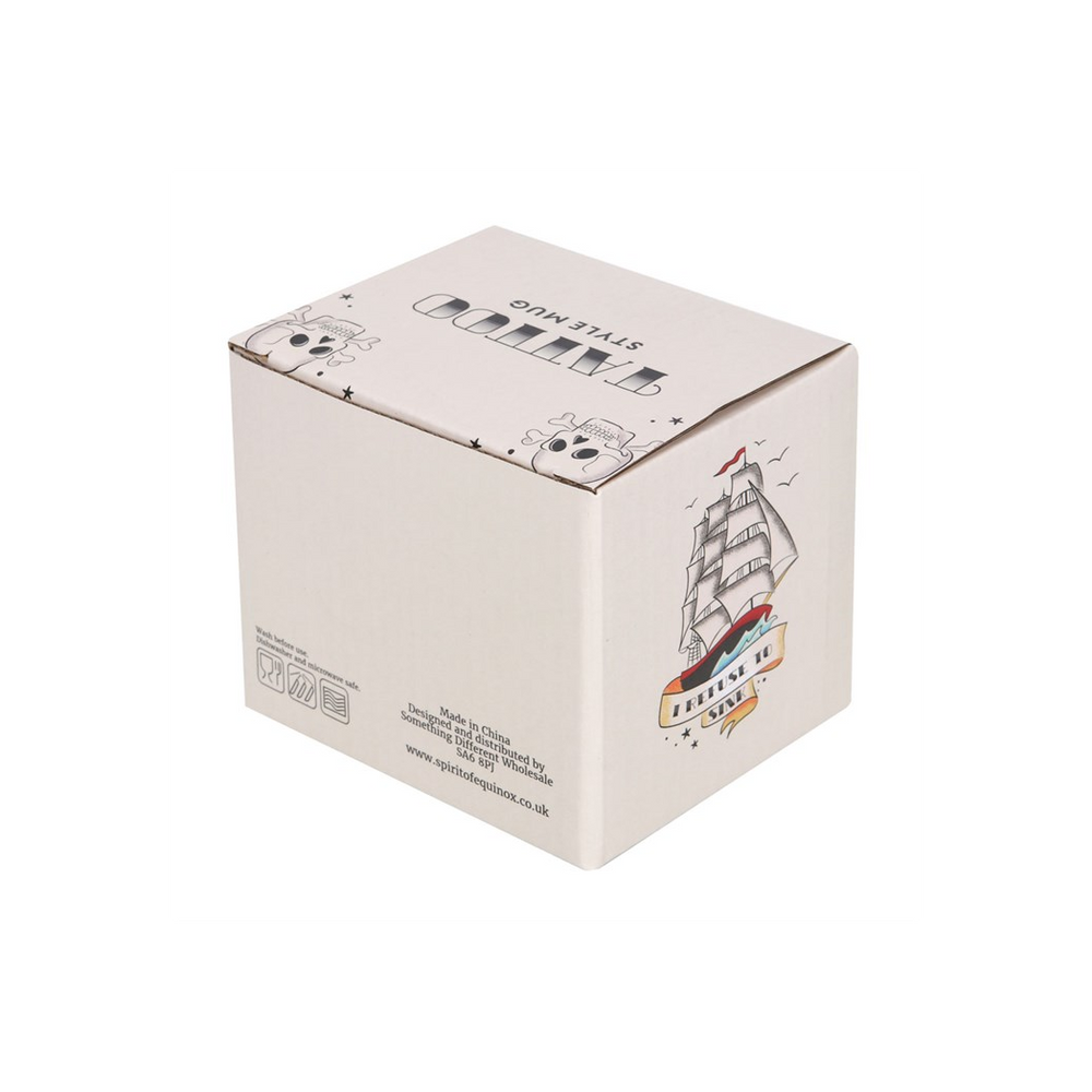 This 'I Refuse to Sink' mug features a ship design in a vintage tattoo inspired style. Ship tattoos are said to represent new journeys and good luck. Product Dimensions: H9.4cm x W8.6cm x D7.7cm Packaged Dimensions: H10.9cm x W9.6cm x D9.1cm